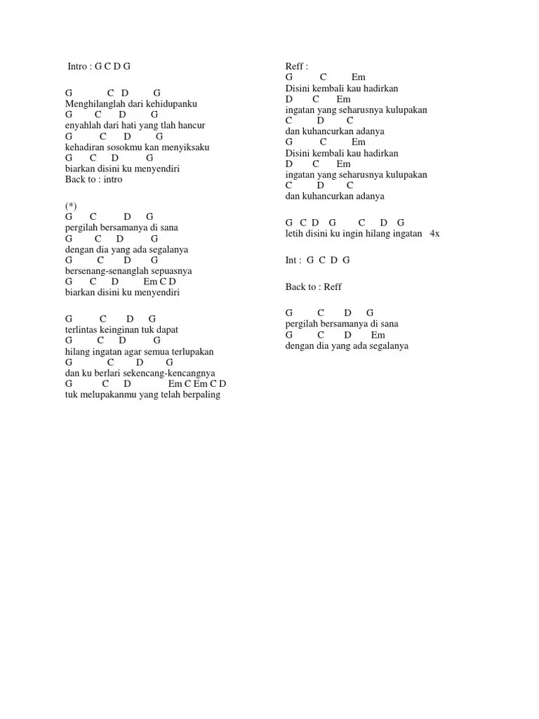 G c d g g c d g menghilanglah dari kehidupanku g c d g enyahlah dari hati yang tlah hancur g c d g. G c d g g c d g menghilanglah dari kehidupanku. Lirik dan kunci gitar lagu 'ingin hilang ingatan' dari rocket rockers lagu ingin hilang ingatan termasuk album better season. Lagu 'ingin hilang ingatan' ini . G c d g enyahlah dari hati yang tlah hancur.